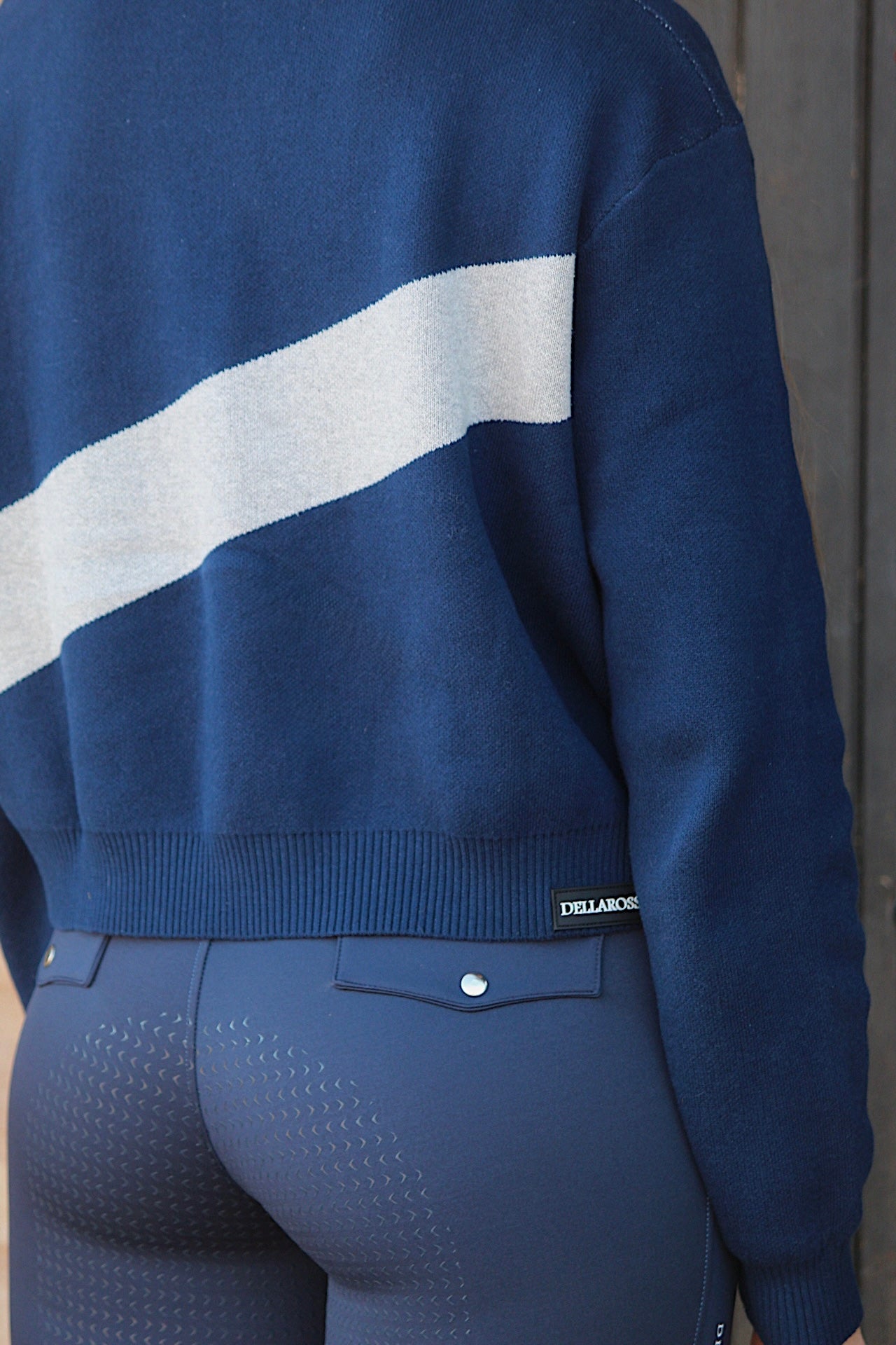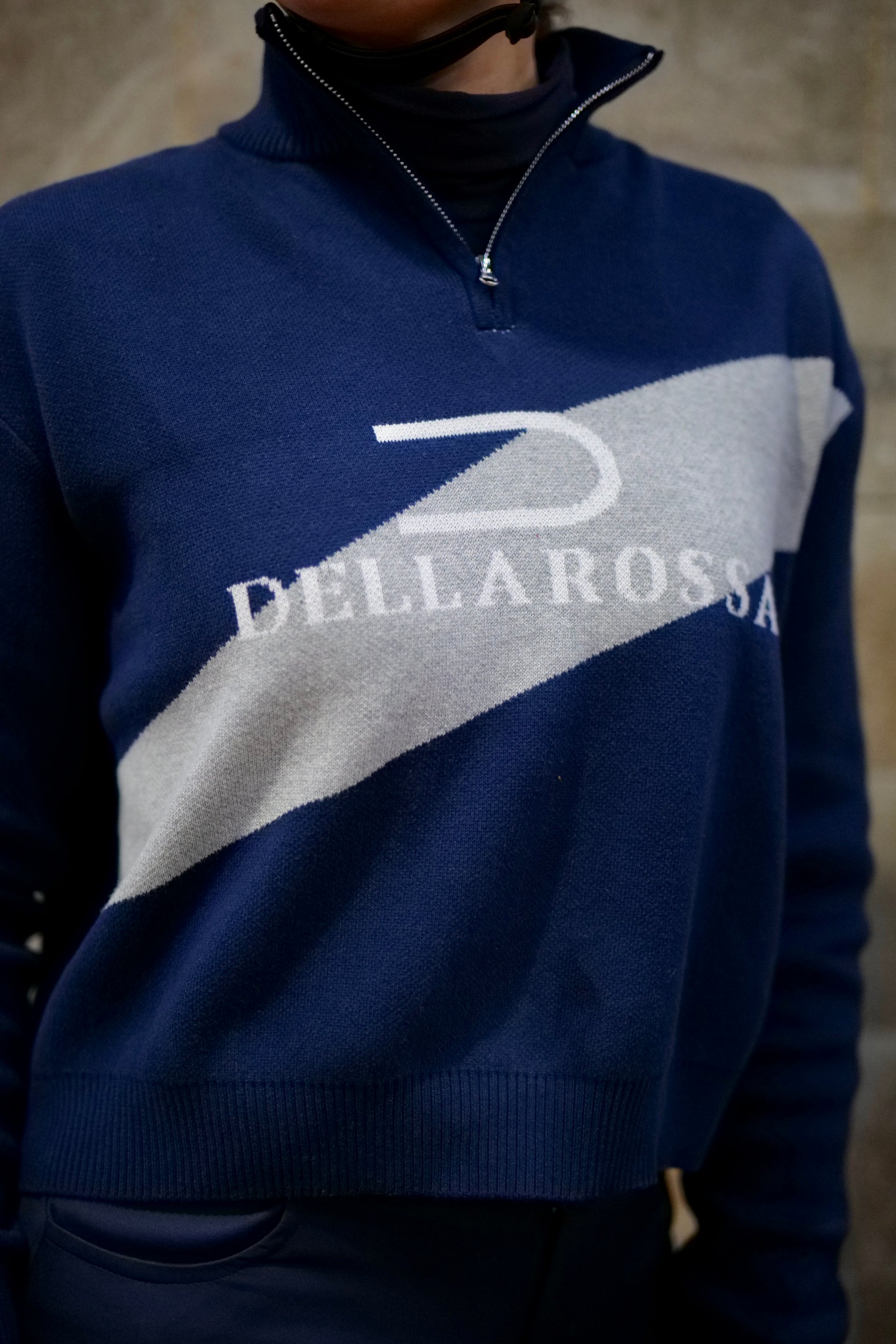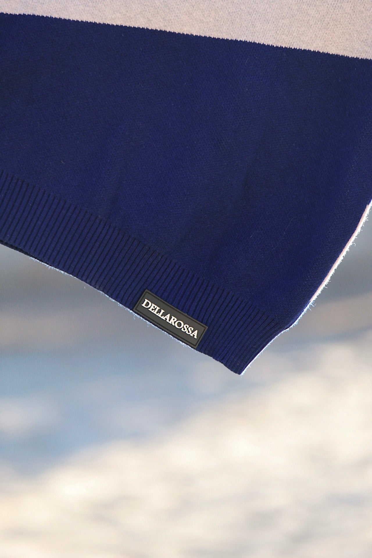 El diseño se completa con un gráfico Dellarossa en contraste, integrado directamente en el tejido, y una etiqueta tejida de la marca en la parte inferior como firma discreta.